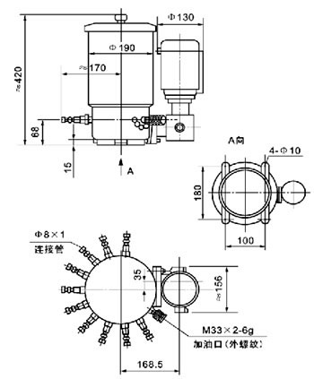 3、向干油泵贮油器内补脂必须使用SJB-D60型手动加油泵或DJB-200型电动加油泵从贮油器的加油口加入,注意在贮油器内无润滑脂时严禁启动电机运转。