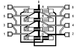 润滑剂以箭头方向进入分配器压送到活塞A的右侧末端。活塞A通过润滑剂压力而向左侧运动。位于活塞A左侧前端的润滑剂通过壳体内部通道输送到排出口2 并从此通过润滑位置管道到达摩擦位置。