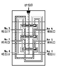 6、流入的润滑剂推动活塞B向右运动、右腔的润滑剂压向NO.5吐出口,经外部配管送向润滑点。当活塞B移动到至右极限时活塞A左腔开始进入润滑剂。
